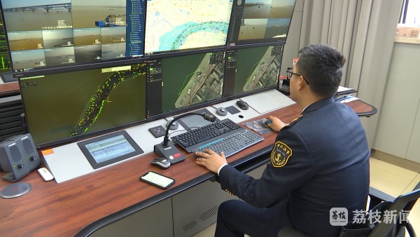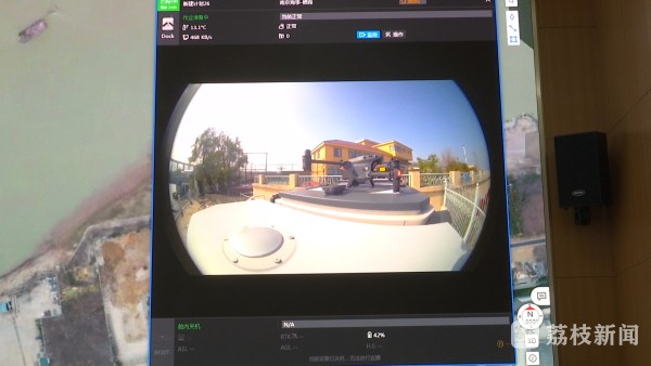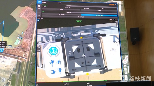 上午,在南京海事局船舶交通管理中心,现场执法人员按下"一键起飞"按钮,部署在40公里外的龙潭海巡执法大队无人机从机场舱盖中飞出,悬停于空中、等待指令。