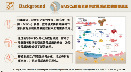 边育红教授介绍,衰老导致的骨质疏松与骨髓间充质干细胞(BMSCs)有密切的联系。随着年龄增加,骨髓间充质干细胞也会逐渐衰老,成骨分化能力随之降低,导致骨代谢平衡失调,从而使人体更容易患上一些与衰老相关的骨类疾病,比如骨质疏松。