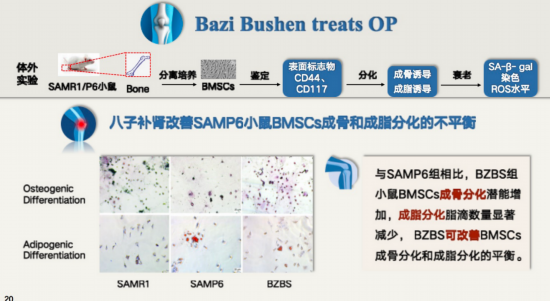 为此,她和研究团队从动物股骨内提取骨髓间充质干细胞进行原代培养和鉴定,通过诱导骨髓间充质干细胞的成骨成脂分化,发现快速骨老化模型小鼠给药八子补肾后,骨髓间充质干细胞成骨分化潜能明显增加,成脂分化数量明显减少,说明八子补肾可改善快速骨老化模型小鼠股骨的骨小梁形态与结构、改善钙磷和衰老相关蛋白含量,改善小鼠BMSCs成骨和成脂分化的不平衡,从而改善快速骨老化模型小鼠BMSCs衰老。