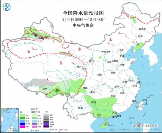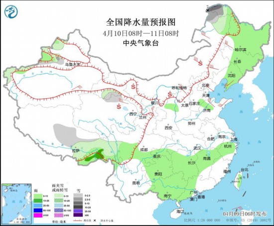 图2 全国降水量预报图(4月9日08时-10日08时)