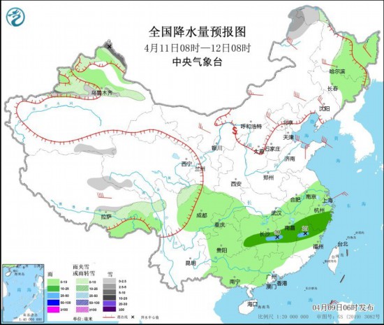 4月11日08时至12日08时,新疆北疆北部和沿天山地区、内蒙古东北部、黑龙江西北部、西藏东部和南部、青海西部、川西高原北部等地部分地区有小到中雪或雨夹雪,其中,新疆阿勒泰北部等地部分地区有中到大雪(5~9毫米)。东北地区东部、西藏东南部、西南地区东部、江淮大部、江南、华南西部和北部等地部分地区有小到中雨,其中,湖南中部、江西中部、福建西北部等地部分地区有大雨(25~40毫米)。内蒙古中东部、东北地区大部、华北东北部、山东半岛等地部分地区有4~6级风,其中,内蒙古东部、西藏中部等地部分地区有6~7级风(见图4)。