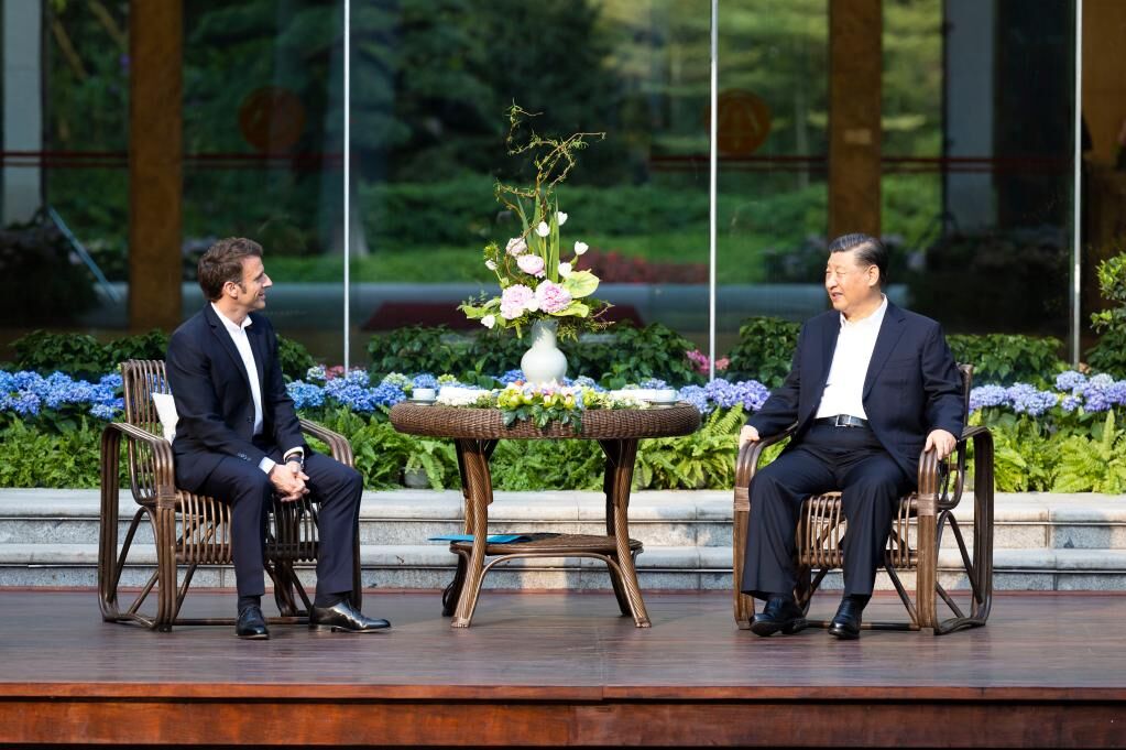4月7日下午,国家主席习近平在广东省广州市松园同法国总统马克龙举行非正式会晤。两国元首临水而坐,观景品茗,纵论古今。新华社记者 黄敬文 摄