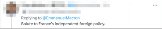 马克龙的这段视频在推特上引发了多国网友的热议。有网友评论称,“向法国独立自主的外交政策致敬”。↓