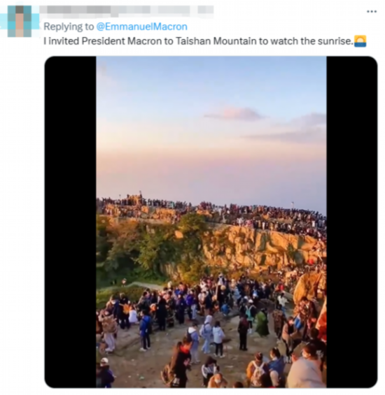 “我邀请马克龙总统到泰山看日出。”还有中国网友这样评论道,另外还附上了中国大好山川的视频。↓