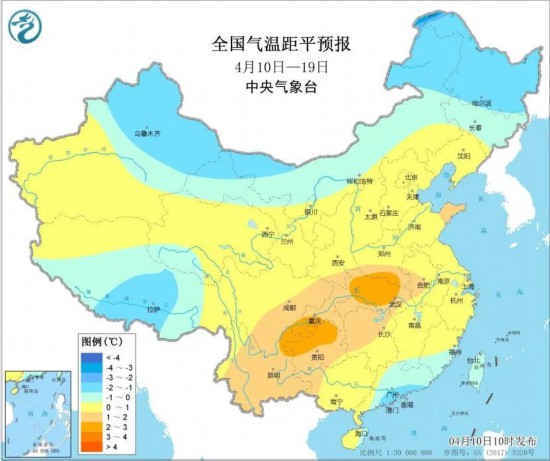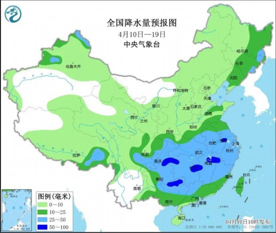 未来10天(4月10-19日),江南大部、江淮、江汉、贵州中东部、四川盆地东部和南部、西藏东南部等地累计降水量有20~50毫米,其中江南北部和华南北部的部分地区可达60~90毫米;新疆北部、内蒙古中东部、西北地区东南部、华北、东北、黄淮等地有5~20毫米,局地超过30毫米;上述部分地区降水量较常年同期偏多2~5成,局地偏多1倍左右。主要降水时段在10-11日、12-14日及18日前后。
