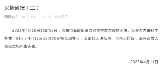 荔枝新闻讯 据西昌发布微信公号消息,2023年4月10日15时55分,西昌市海南街道办民主村发生森林火情。经多方力量科学扑救,明火于4月11日10时50分被全部扑灭,全面转入清烟点、守余火阶段,没有造成人员伤亡和次生灾害。