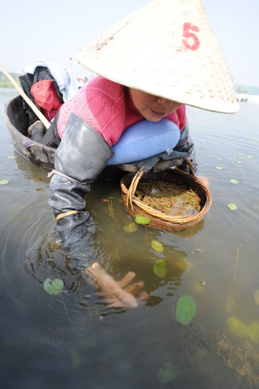 太湖莼菜的嫩叶均躲藏在水面30厘米以下,采摘莼菜时,需趴在菱桶里,双手划水,交替采摘。莼菜浑身都是一种胶状物,非常滑,一般人很难捉住,只有“老手”看准了水下的莼菜,手一伸一掐才能摘下来。正因如此,有了“莼菜好吃不好采”的这句俗语。