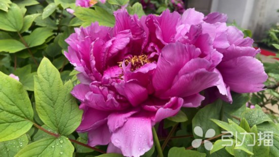 牡丹花占地十多平方米,层层绿叶衬红花,绿叶上尚有刚落下的雨水,显得格外清新。一些花瓣被雨滴打落在花圃的泥土里,花圃是用青石条围成的,正前方的石碑刻有“姚家牡丹”的简介,花丛中还有古树名木的标牌。