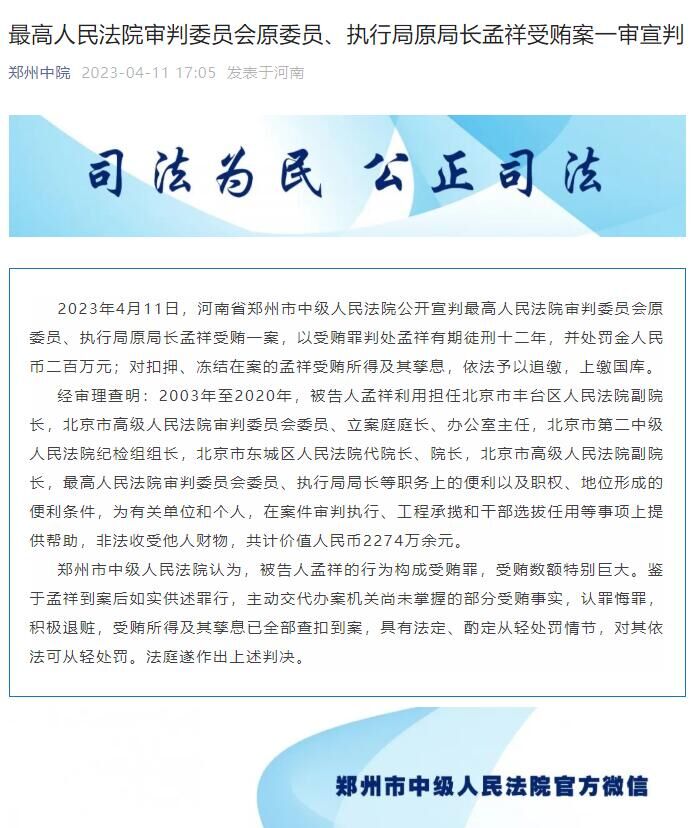 荔枝新闻讯 据郑州中院微信公号消息,2023年4月11日,河南省郑州市中级人民法院公开宣判最高人民法院审判委员会原委员、执行局原局长孟祥受贿一案,以受贿罪判处孟祥有期徒刑十二年,并处罚金人民币二百万元;对扣押、冻结在案的孟祥受贿所得及其孳息,依法予以追缴,上缴国库。