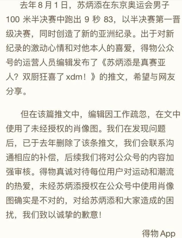 随后据中国新闻网消息,得物回应称,该起事件为2021年8月,苏炳添在东京奥运会男子100米半决赛中创造了新的亚洲纪录,出于对新纪录的激动心情和对他本人的喜爱,得物公众号的运营人员编辑发布了相关推文,但在文中使用了未经授权的肖像图。