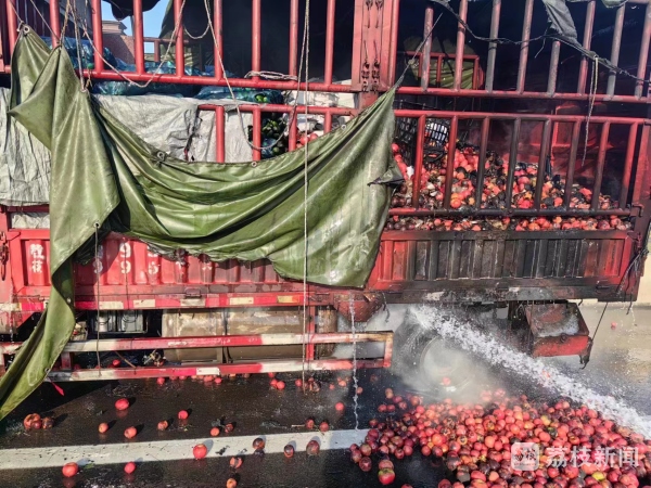 通过车主了解到,起火的是一辆从山东临沂开往无锡水果批发市场的大货车,车上载满了4吨苹果,价值2万元。在行驶过程中,轮胎突然爆炸,导致货车起火。虽然司机立即使用灭火器对车进行了初期的火灾扑救,但是由于火势猛烈,无法达到灭火的作用。