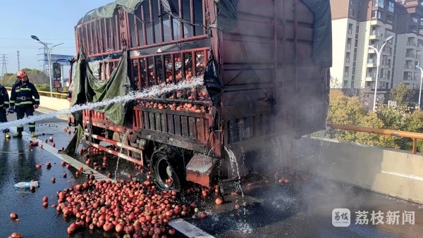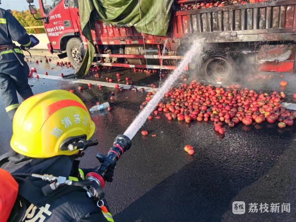 姜堰开发区专职队到场后发现货车轮胎着火引发的车辆着火,车上装载了一整车的苹果。由于货车起火,部分苹果撒落在地上,同时伴随着冒烟,消防救援人员持续用水枪对货车底部轮胎进行灭火,经过约35分钟的处置,现场已无明火。在确认无复燃可能后,姜堰开发区专职队返队。
