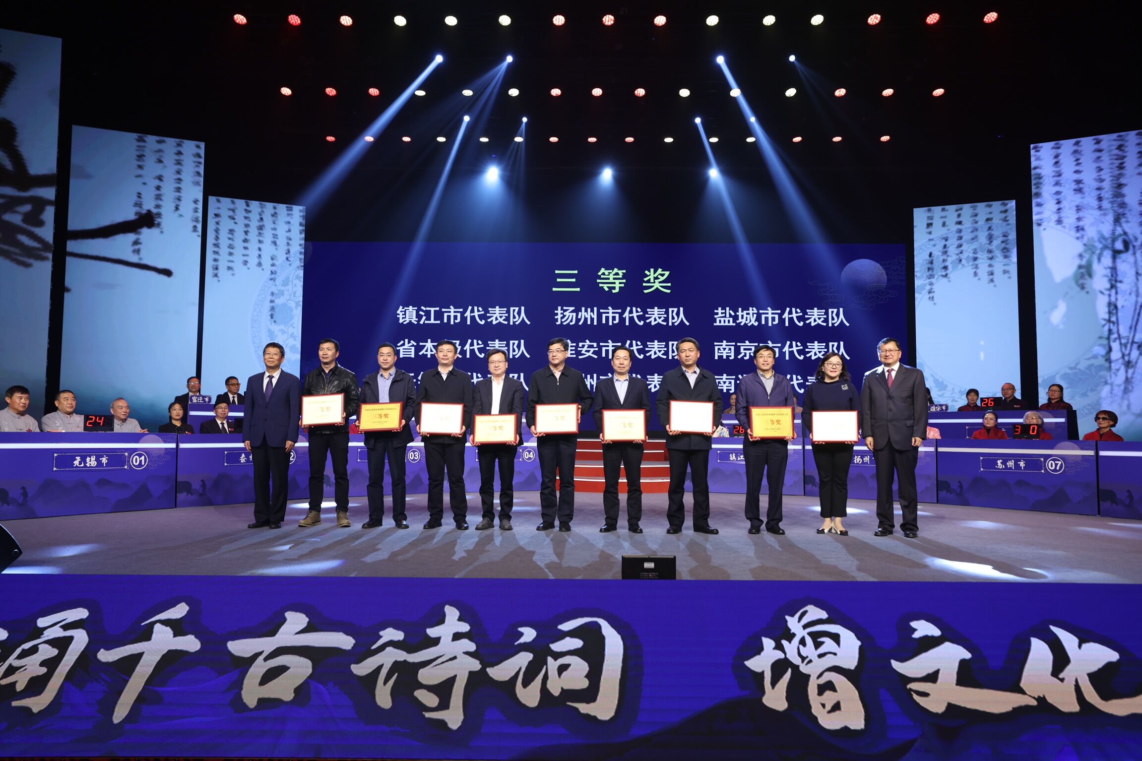本次诗词大会赛题种类多样,涵盖了红色诗词、文学常识、社保知识,分为挑战多宫格、联想对对碰、社保诗词通、速度与诗情、你划我猜、飞花令六个比赛环节。来自全省各地的14支代表队、84名参赛选手,以诗会友,以诗寄情,奉献了一场诗词盛宴。经过激烈角逐,常州市代表队与连云港市代表队荣获一等奖。