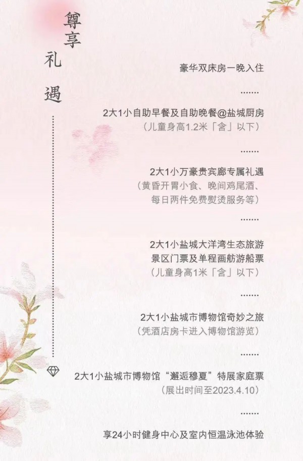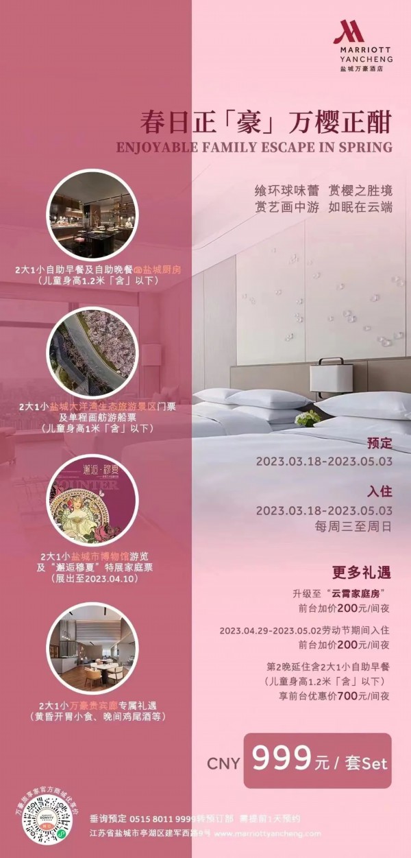 “春日正豪 万樱正酣”踏春客房套餐,预订及使用时间即日起至2023.5.3(每周三至周日)。在盐城万豪,开启一场春日漫游之旅!