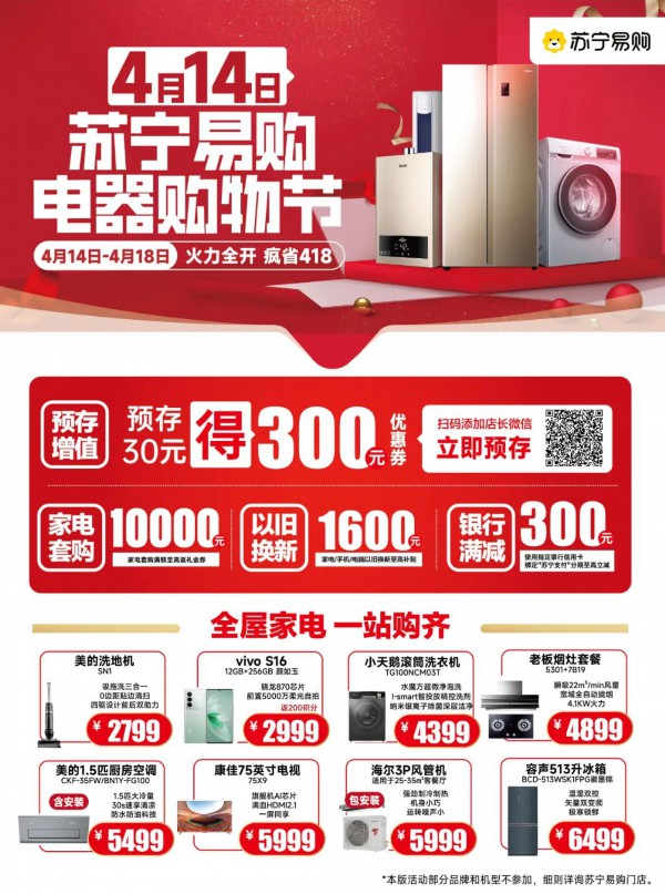 4.14电器购物节:优选商品,价格实惠!预存30元得300元优惠券,更多家电套购优惠、以旧换新、银行满减活动,买家电到苏宁~