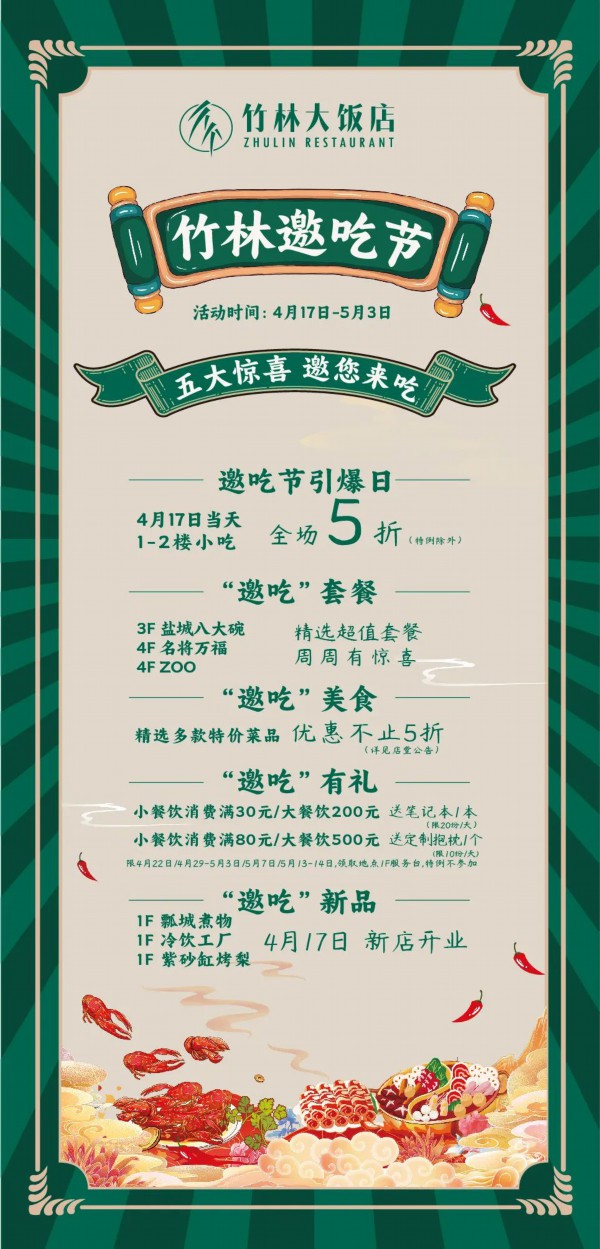 4.17当日在竹林大饭店1-2楼小吃铺子消费,全场5折!飞球火锅、盐城八大碗、万福烤肉“邀吃”套餐也会每周上新!邀吃节当天还有新店开业,这些羊毛还不来薅?