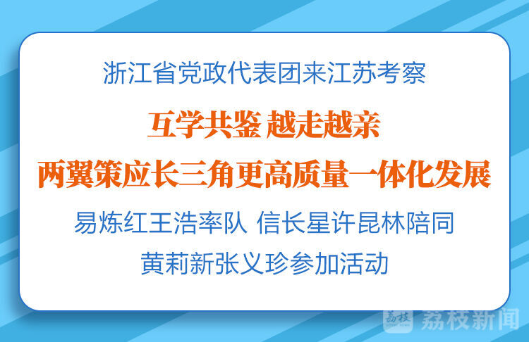 荔枝新闻讯 4月12日,浙江省委书记、省人大常委会主任易炼红,省委副书记、省长王浩率浙江省党政代表团来江苏考察,进一步深化两省合作交流,共同推动长三角一体化发展走深走实。江苏省委书记、省人大常委会主任信长星,省委副书记、省长许昆林陪同考察。浙江省政协主席黄莉新、江苏省政协主席张义珍参加活动。