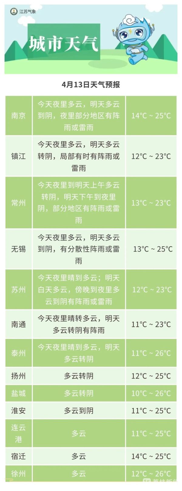 4月13日20时至4月14日20时,全省阴有阵雨或雷雨。最高温度:沿江和苏南地区25~26℃,其他地区24℃左右。最低温度:淮北地区13℃左右,其他地区16~17℃。全省东南风4级左右转偏北风5级阵风6-7级。