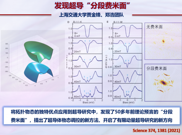 上海交大物理与天文学院教授、李政道研究所平台建设学者郑浩代表团队对研究成果作了介绍。他详细介绍了超导态“分段费米面”的物理背景、实验过程、研究结果和学术价值。强调将拓扑绝缘体表面态费米速度大的优势,跨领域的应用到超导研究中来,是解决问题的关键。