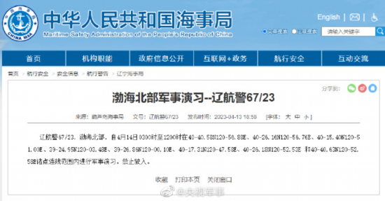 据中国海事局网站消息,葫芦岛海事局发布航行警告,4月14日3时至12时,渤海北部进行军事演习,禁止驶入。