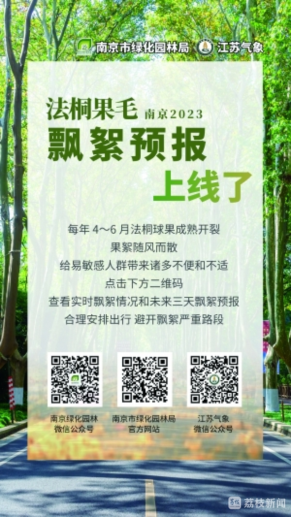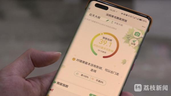 可以看到,在南京绿化园林微信公众号、南京园林局官网和江苏气象微信公众号内,只要点击想要查看的路段,很快就能看到该路段最近这段时间的飘絮情况,如果指数低于50,基本无需防护,但如果在50以上,“过敏宝宝”们就要警惕了。