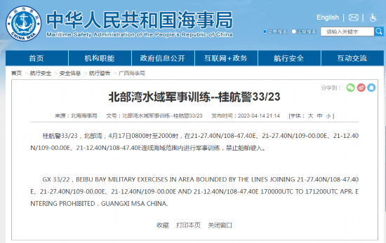 桂航警33/23,北部湾,4月17日0800时至2000时,在21-27.40N/108-47.40E、21-27.40N/109-00.00E、21-12.40N/109-00.00E、21-12.40N/108-47.40E连线海域范围内进行军事训练,禁止船舶驶入。