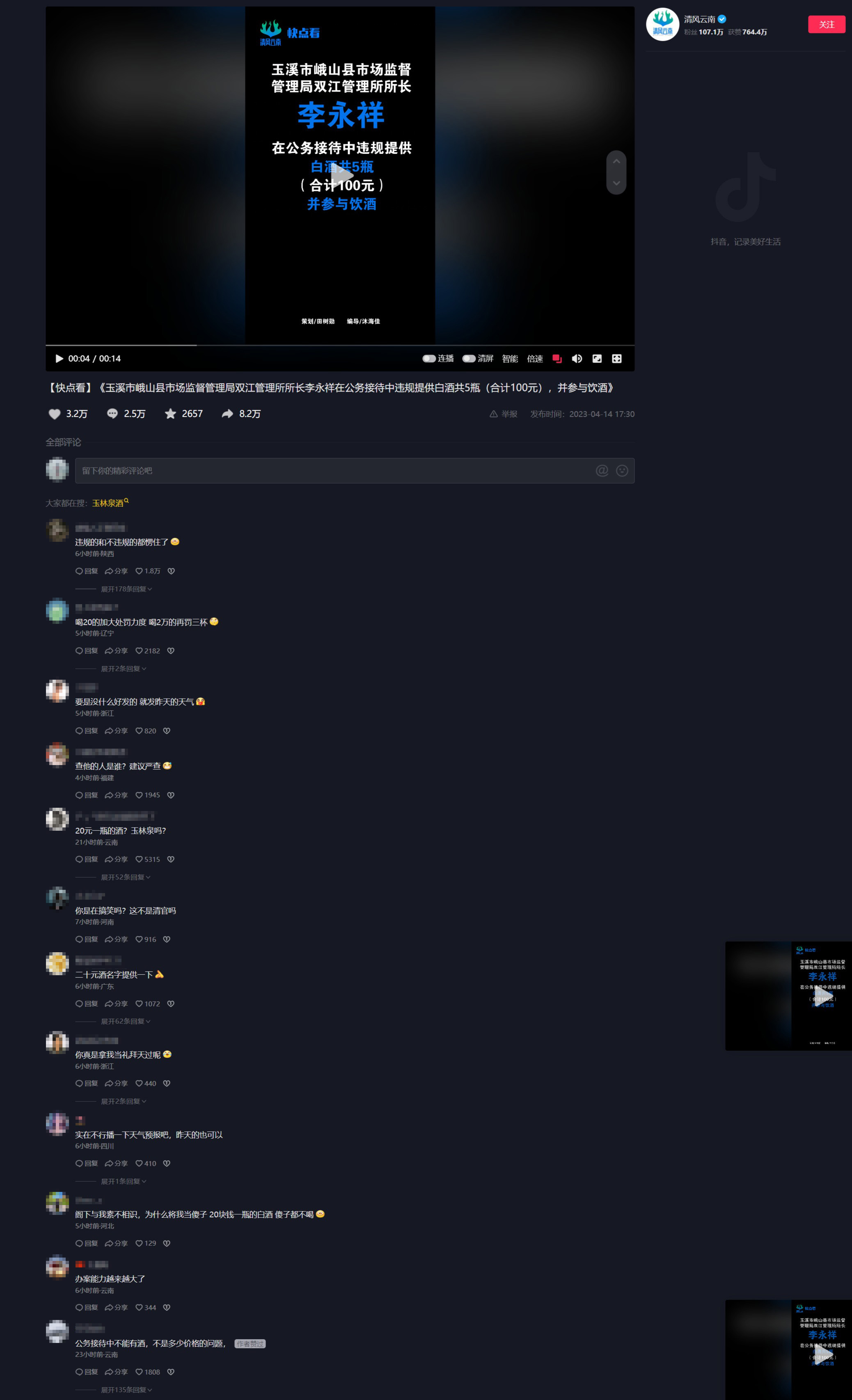 4月14日,云南省纪委省监委官方抖音号“清风云南”发布了题为《玉溪市峨山县市场监督管理局双江管理所所长李永祥在公务接待中违规提供白酒共5瓶(合计100元),并参与饮酒》的短视频,不少网友在评论区中提出质疑,认为20元一瓶的酒“不值得”处分。