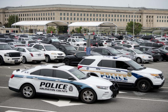 这是2021年8月3日在美国弗吉尼亚州阿灵顿的五角大楼附近拍摄的警车。新华社记者刘杰摄