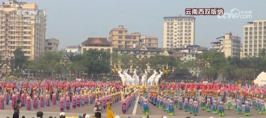 在西双版纳,民族民间传统文化大游演在泼水广场举行。上千人在广场上共舞,充分展示了傣族的手势舞、伞舞、象脚鼓舞、章哈、织锦技艺、贝叶经制作技艺等民族文化瑰宝。