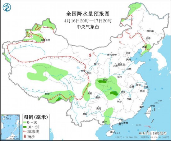 图1 全国降水量预报图(4月16日20时-17日20时)
