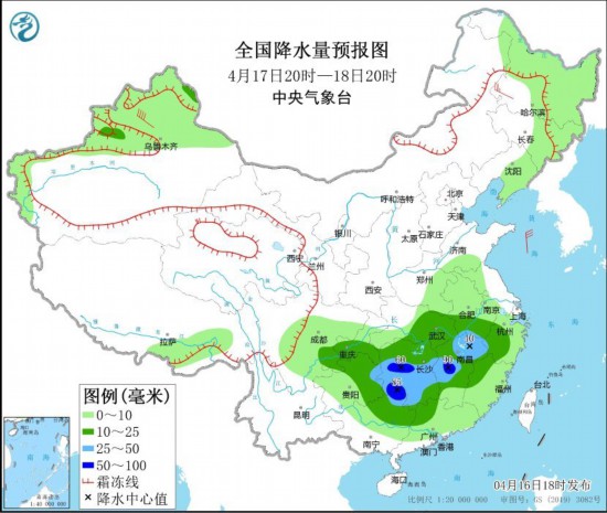 4月17日20时至18日20时,新疆阿勒泰山区和沿天山高海拔地区等地部分地区有小到中雪或雨夹雪,其中,新疆阿勒泰山区局地有大雪或暴雪;西南地区东部、江南大部、江汉东部、江淮西部、华南北部等地部分地区有中到大雨,其中,湖南中西部和南部、广西东北部、江西中部等地部分地区有暴雨(50~90毫米)。黑龙江西南部等地部分地区有4~6级风,其中,新疆沿天山部分地区有6~7级风。黄海大部、东海北部海域将有6~7级、阵风8级的风(见图2)。