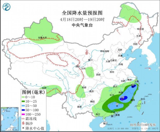 4月18日20时至19日20时,新疆沿天山高海拔地区、内蒙古东北部、西藏南部等地部分地区有小到中雪或雨夹雪;江南中东部和南部、华南中北部和东部等地部分地区有中到大雨,其中,江西中南部、福建西部、浙江中部等地部分地区有暴雨或大暴雨(100~105毫米)。新疆沿天山地区、内蒙古西部和中部等地部分地区有4~7级风。东海大部海域、台湾海峡、台湾以东洋面将有6~7级、阵风8级的风(见图3)。