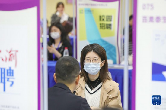 4月16日,学生(左)在春季双选会现场与用人单位交流。新华社记者 毛俊 摄