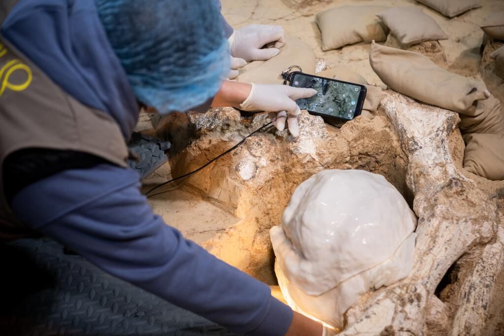 2022年12月3日,考古队员在提取头骨化石。新华社记者伍志尊 摄
