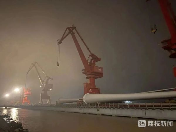 晚上8点半,111.5米级海上风电叶片在射阳港出海。
