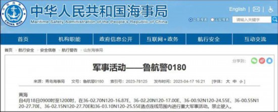 据中国海事局网站消息,青岛海事局发布航行警告,4月18日9时至12时,黄海部分海域进行重大军事活动,禁止驶入。