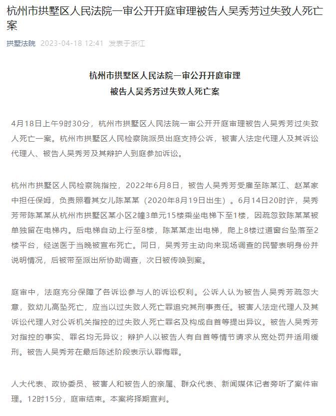 荔枝新闻讯 据拱墅法院微信公众号消息,4月18日上午9时30分,杭州市拱墅区人民法院一审公开开庭审理被告人吴秀芳过失致人死亡一案。杭州市拱墅区人民检察院派员出庭支持公诉,被害人法定代理人及其诉讼代理人、被告人吴秀芳及其辩护人到庭参加诉讼。
