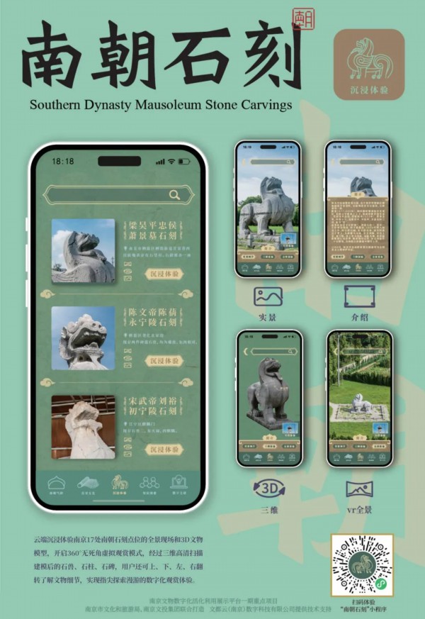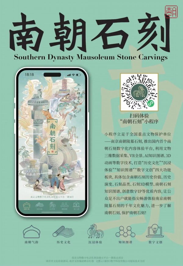 小程序立足于全国重点文物保护单位——南京南朝陵墓石刻,推出国内首个南朝石刻数字化内容体验平台,利用文物三维数据采集、VR全景、AI知识图谱、3D动画等数字技术,打造“历史文化”“沉浸体验”“知识图谱”“数字文创”四大功能板块,具体包含南朝石刻历史价值、历史演变、石刻品类、石刻3D模型、南朝石刻知识图谱、创意数字IP等优质内容,让公众足不出户就能指尖畅游体验南京南朝陵墓石刻的千年文化魅力,进一步了解南朝石刻、保护南朝石刻。
