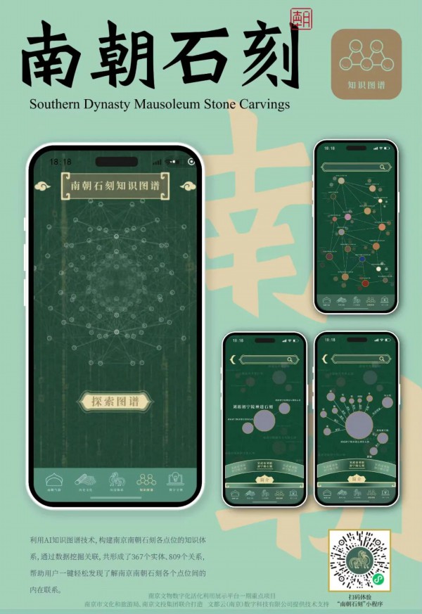 利用AI知识图谱技术,构建南京南朝石刻各点位的知识体系,通过数据挖掘关联,共形成了367个实体、809个关系,帮助用户一键轻松了解发现南京南朝石刻各个点位间的内在联系。