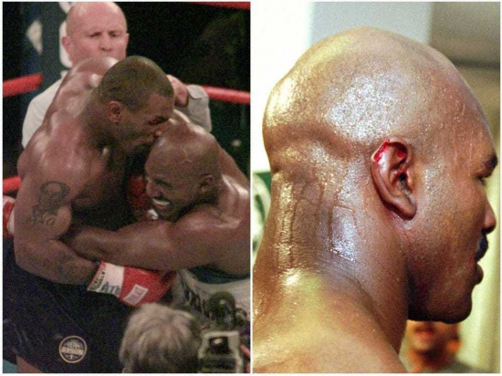 在1997年泰森与霍利菲尔德的比赛中,曾发生震惊拳坛的“咬耳朵”事件。当时,泰森在拳击场上将霍利费尔德的耳朵咬下一块,被裁判宣布取消比赛资格,霍利费尔德获得胜利。泰森还因为在那场比赛中的不当行为而一度失去拳击执照,并支付了300万美元罚款。