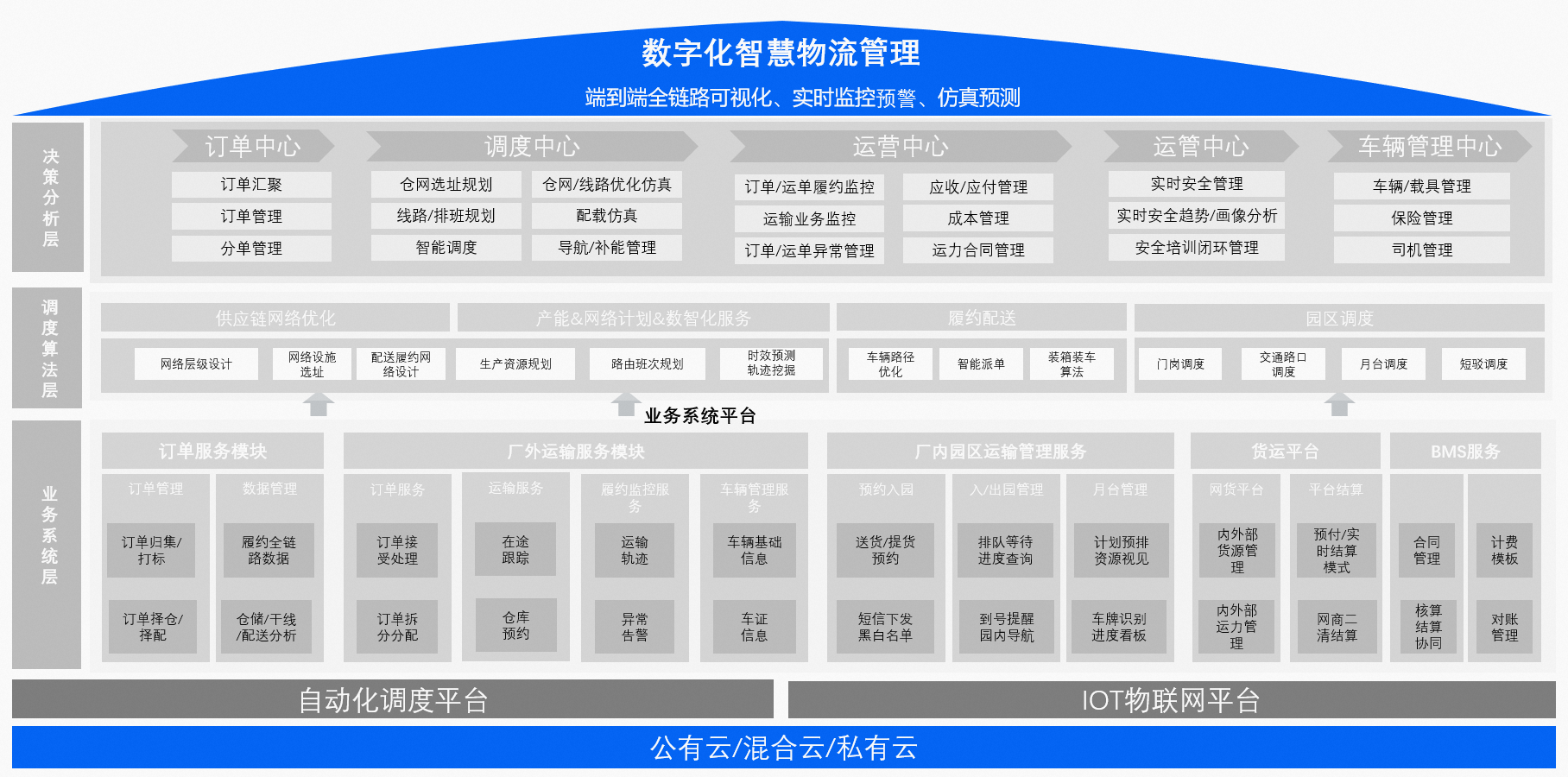 以菜鸟智慧物流管理系统为例,作为一套服务于汽车行业主机厂全场景的物流管理系统解决方案,其功能已覆盖零部件入厂物流、厂内物流、整车销售物流、售后备件物流等主机厂4大主流物流业务场景。作为系统的重要构成,决策分析系统可以通过订单中心、调度中心、运营中心、结算中心、车辆管理中心等5大中心,服务零部件、整车、售后备件的全部运输场景业务,实现运输过程全程可视和物流生态闭环管理,形成物流、商流、信息流的三流合一;调度算法平台则可通过供应链网络优化中心、产能&网络计划&数智化服务中心、履约配送中心、园区调度中心,实现业务决策数字化,运营管理自动化、智能化。