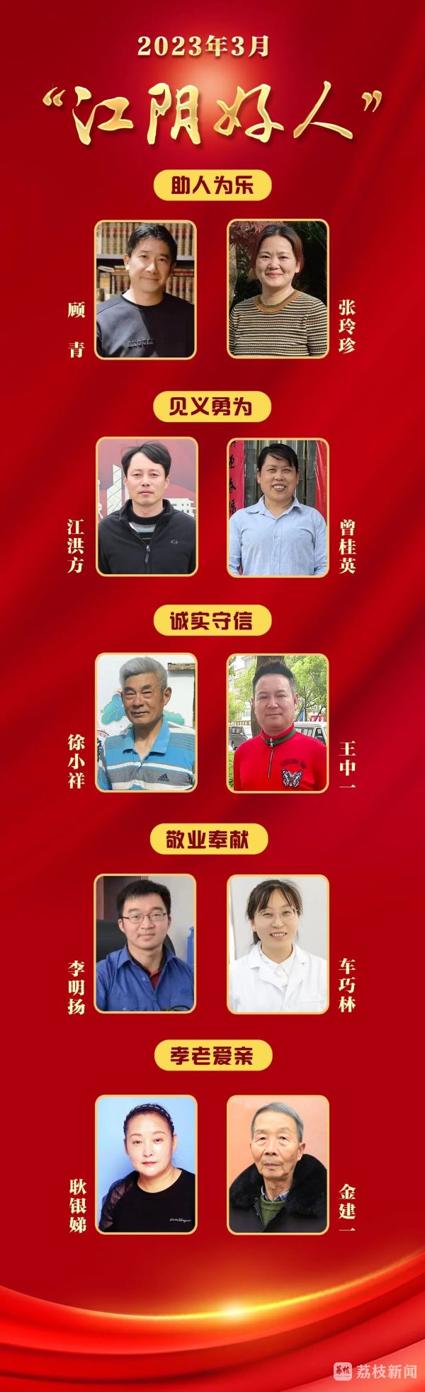 江阴好人是最闪亮的城市名片,他们的感人事迹是城市文明的记忆,也是引领社会文明风尚的道德力量。2023年3月“江阴好人”来了!