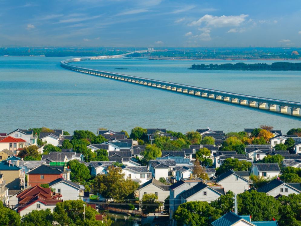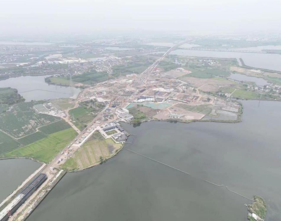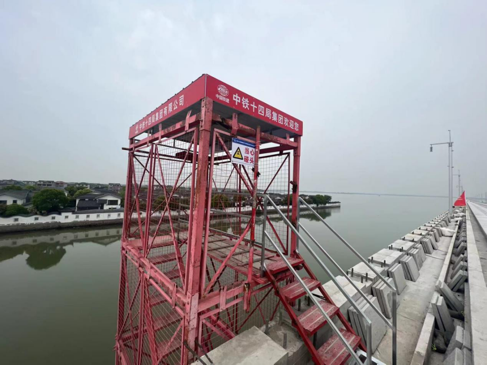 通过梯笼爬上建设中的沪苏湖铁路高架,向东望去,一道铁路水泥“长龙”横卧在元荡湖的碧波上,不远处就可以看见上海青浦。