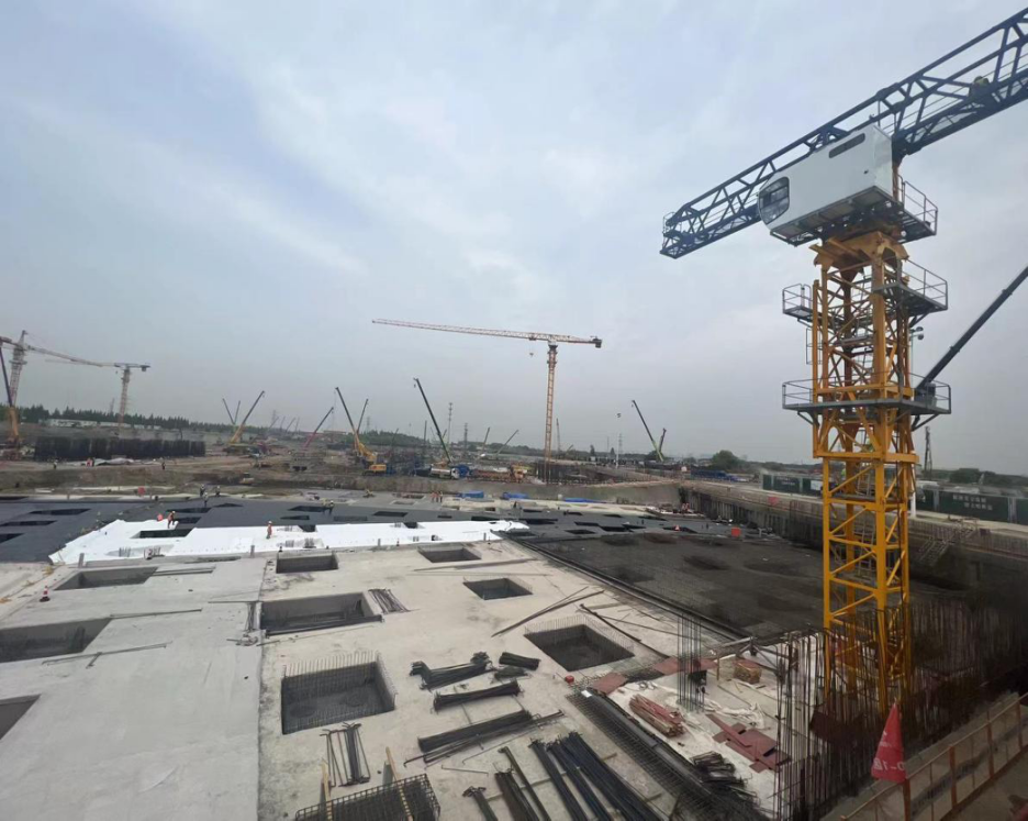 塔吊林立、机器轰鸣,挖掘机、运输车往来络绎不绝,从空中俯瞰,施工现场多名工人和百台机器正紧张而有序地开工,苏州南站基本轮框已成型。