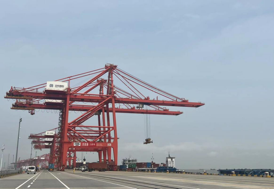 远洋轮踏浪而来,岸边吊机起落装卸,太仓港四期码头上,双悬臂梁轨道吊正在两排集装箱卡车上空自动化作业,迅速完成集装箱吊装。
