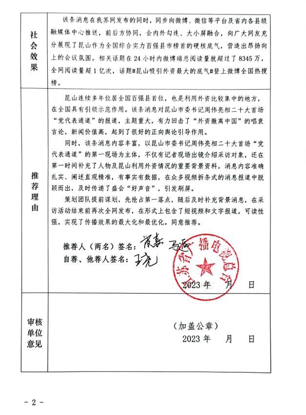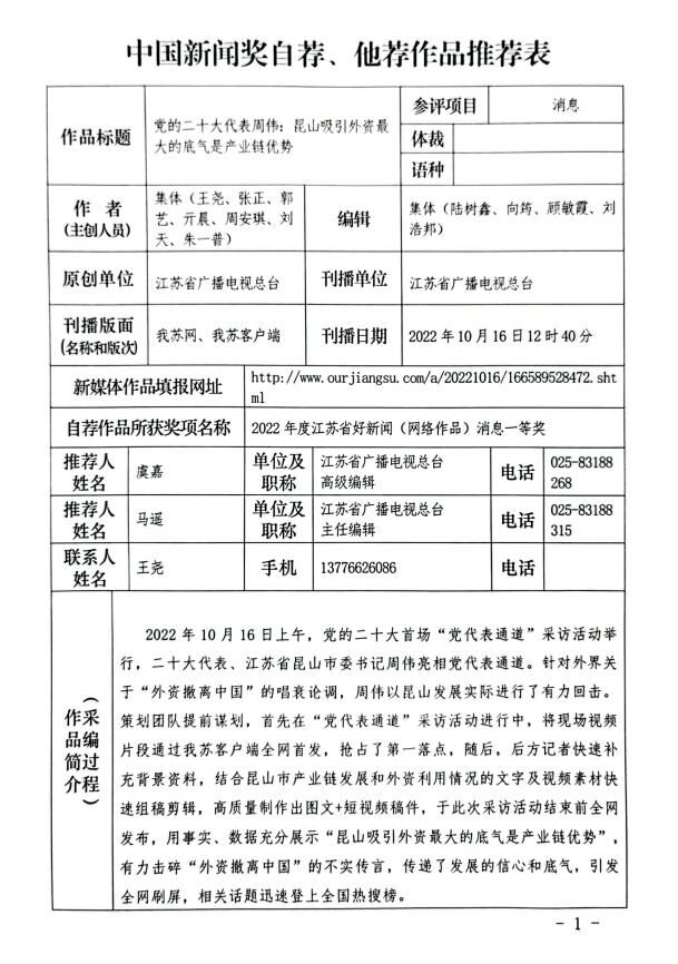 根据《中国新闻奖评选办法》和《第33届中国新闻奖参评作品报送通知》要求,2022年10月16日在我苏网、我苏客户端播发的稿件《党的二十大代表周伟:昆山吸引外资最 大的底气是产业链优势》拟按自荐(他荐)方式参评第三十三届中国新闻奖。