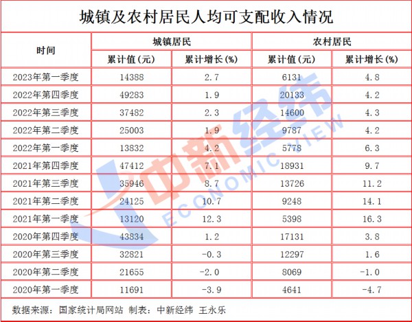 分城乡看,一季度城镇居民人均可支配收入14388元,同比名义增长4.0%,扣除价格因素,实际增长2.7%;农村居民人均可支配收入6131元,同比名义增长6.1%,扣除价格因素,实际增长4.8%。