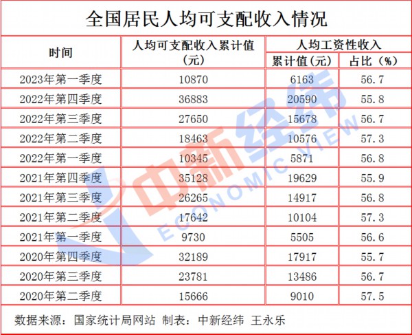 按收入来源分,一季度,全国居民人均工资性收入6163元,增长5.0%,占可支配收入的比重为56.7%;人均经营净收入1834元,增长5.8%,占可支配收入的比重为16.9%;人均财产净收入958元,增长4.1%,占可支配收入的比重为8.8%;人均转移净收入1915元,增长5.1%,占可支配收入的比重为17.6%。