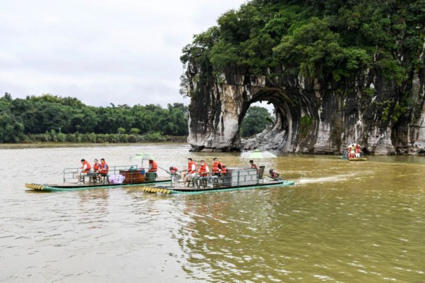 游客在广西桂林乘坐竹筏游览象鼻山(2022年6月29日摄) 曹祎铭摄/本刊