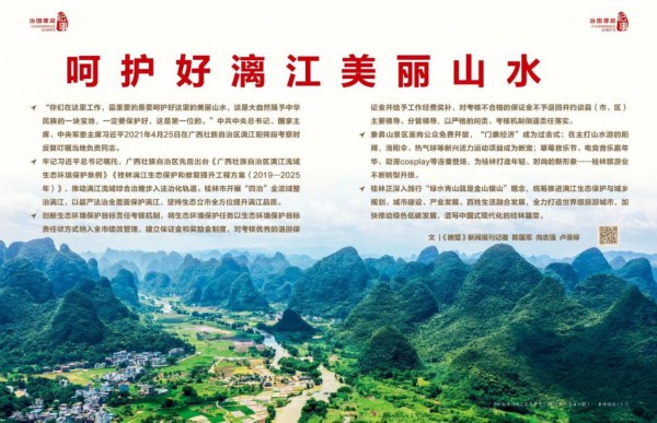 ◆ 牢记习近平总书记嘱托,广西壮族自治区先后出台《广西壮族自治区漓江流域生态环境保护条例》《桂林漓江生态保护和修复提升工程方案(2019—2025年)》,推动漓江流域综合治理步入法治化轨道。桂林市开展“四治”全流域整治漓江,以最严法治全覆盖保护漓江,坚持生态立市全方位提升漓江品质。